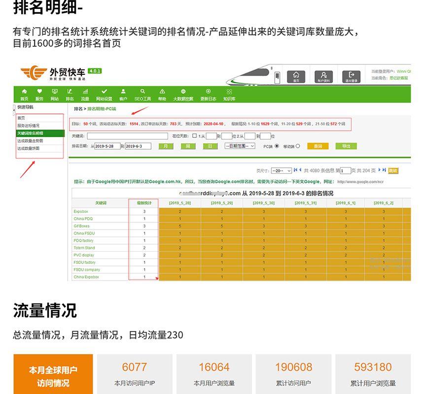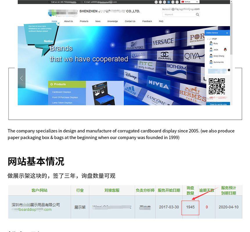 該公司是一家專業(yè)設計和制作各類紙貨架,紙貨架、紙展示架、獨立牌、包裝彩盒、促銷彩盒、促銷堆頭等POP展示用品公司,產(chǎn)品直銷國內(nèi)和歐洲、北美、東南亞等地區(qū)。終端展示類紙制品以其環(huán)保低耗、成本價廉、絢麗多姿、裝運輕便,使用方便,促銷效果顯著等優(yōu)點在國外發(fā)達地區(qū)已發(fā)展為主要的終端展示用制品,國內(nèi)市場中該類制品業(yè)正逐步被各大中型日用品,冷飲和服裝品牌企業(yè)股份使用!一次性簽約外貿(mào)快車3年服務,共計拓展了4000多個產(chǎn)品相關關鍵詞,目前已有1600多個關鍵詞排名在谷歌首頁,這些關鍵詞每天可為該網(wǎng)站帶來200多個流量,客戶共計收到近2000個詢盤。
