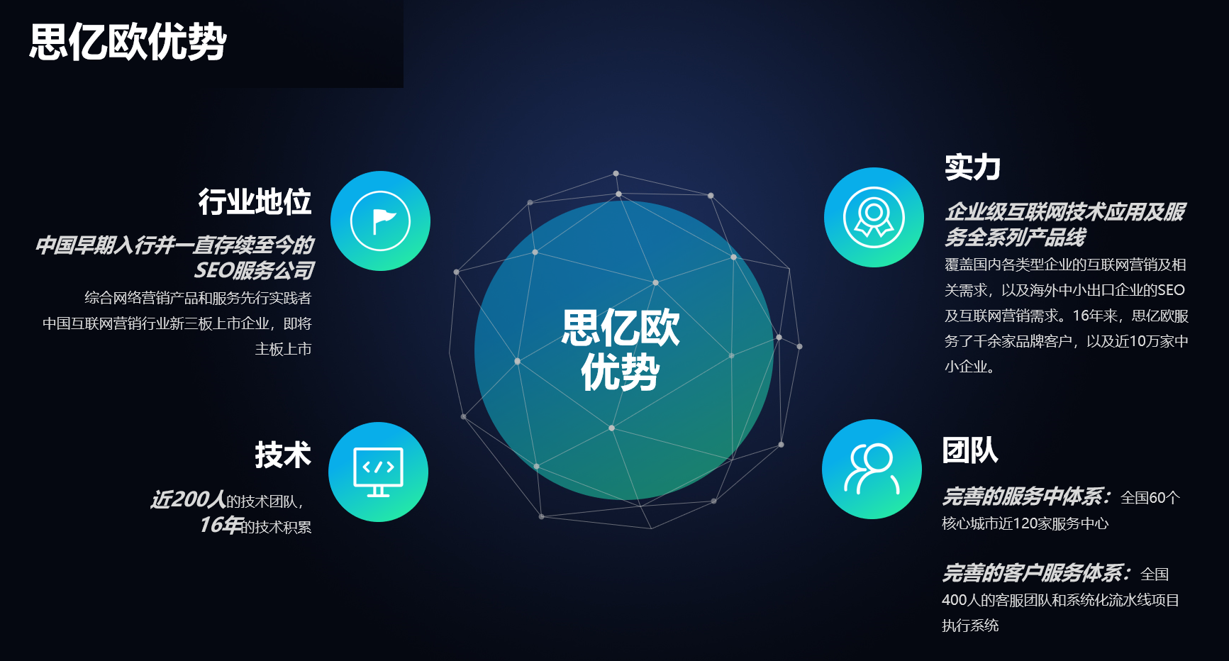 成立于2003年,致力于為中國各類型企業(yè)提供互聯(lián)網(wǎng)技術(shù)應(yīng)用產(chǎn)品和服務(wù),是國家高新技術(shù)企業(yè)、新三板掛牌企業(yè)(股票簡稱:思億歐,股票代碼:839255)。16年的從業(yè)經(jīng)驗(yàn),思億歐建立了自主一體化的技術(shù)體系,積累了堅(jiān)實(shí)的的技術(shù)實(shí)力和客戶基礎(chǔ)。如今,思億歐擁有企業(yè)級互聯(lián)網(wǎng)技術(shù)應(yīng)用產(chǎn)品線:外貿(mào)快車、億企寶、沸客社交營銷軟件、整站優(yōu)化、領(lǐng)真VR軟件。