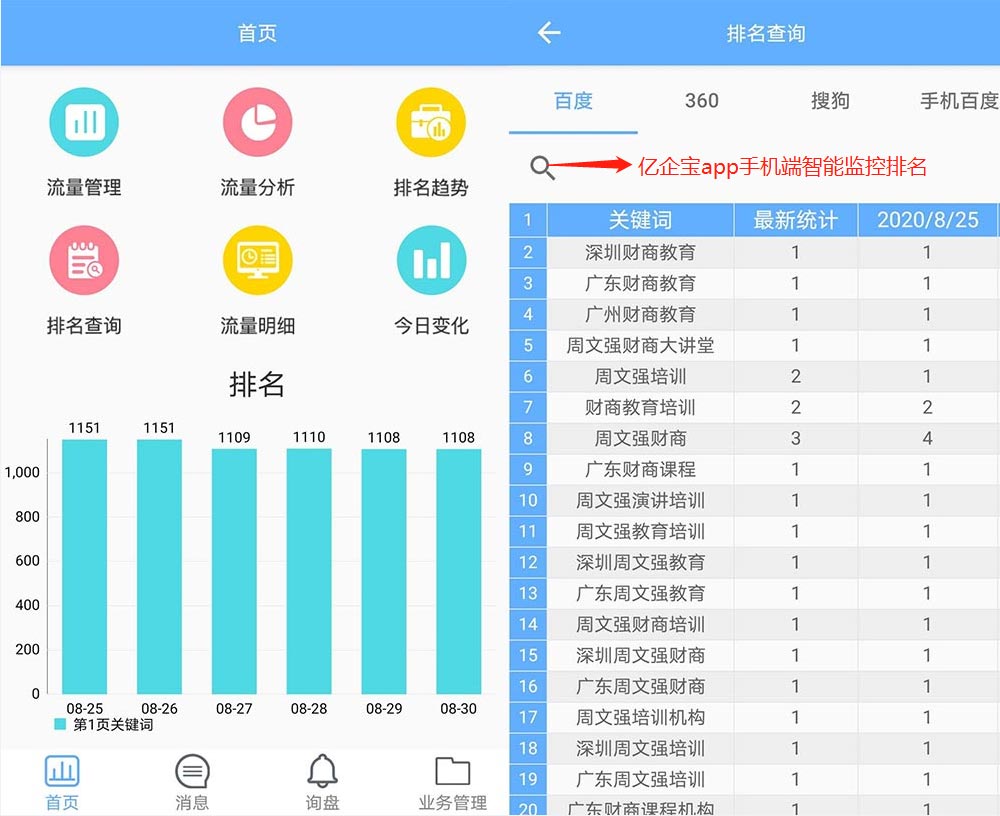 億企寶App:隨時(shí)隨地查看和管理關(guān)鍵詞排名、流量、訪問來(lái)路、詢盤,與客戶實(shí)時(shí)溝通互動(dòng)。